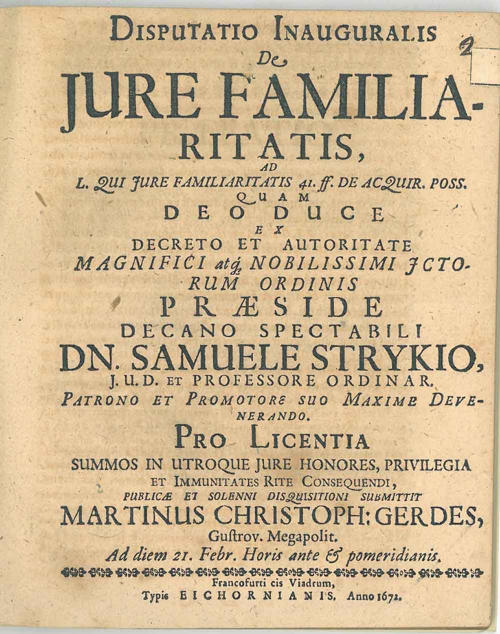 Disputatio inauguralis De Jure Familiaritatis. Pro Licentia summos in utroque jure honores, privilegia.publicae et solenni disquisitioni submittit.