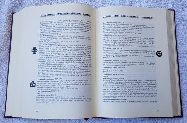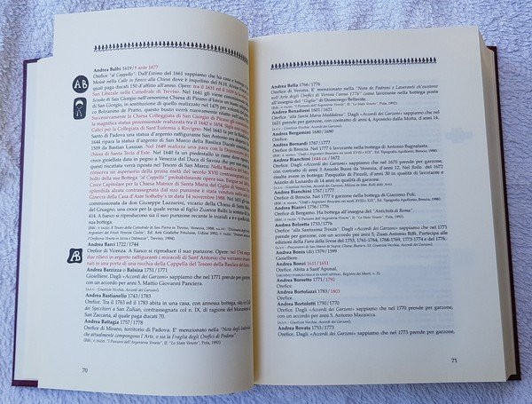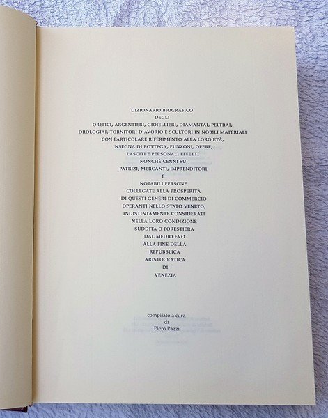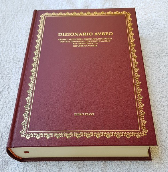 1 lingua: italiano Legat. edit. rigida con titoli e decori dorati al piatto e al dorso, cm 25x18, pag. 863, con numerosissime riproduzioni di marchi - a cura di Piero Pazzi - edizione a tiratura limitate di 600 esemplari, stampato su carta pregiata - Dizionario Aureo: dizionario biografico degli orefici, argentieri, gioiellieri, diamantai, peltrai, orologiai, tornitori d'avorio e scultori in nobili materiali con particolare riferimento alla loro età, insegna di bottega, punzoni, opere, lasciti e personali effetti, nonché cenni su patrizi, mercanti, imprenditori e notabili persone collegate alla prosperità di questi generi di commercio operanti nello Stato Veneto, indistintamente considerati nella loro condizione suddita o forestiera, dal Medio evo alla fine della Repubblica aristocratica di Venezia - prezioso repertorio, con informazioni su migliaia di artigiani ed artisti, note biografiche e sull'attività professionale, riferimenti bibliografici e d'archivio - Perfetto stato.