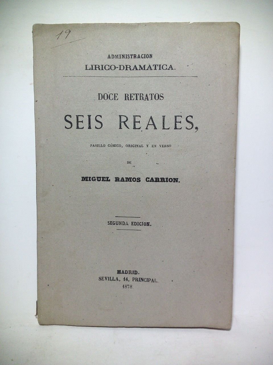 2ª Ed.- Madrid: Imp. de José Rodriguez, 1878.- 35 p.; 4º menor (20,2 x 13,3 cm).- (Administración Lírico-Dramática de Don Eduardo Hidalgo).* TEATRO ESPAÑOL DE LOS SIGLOS XIX-XXI