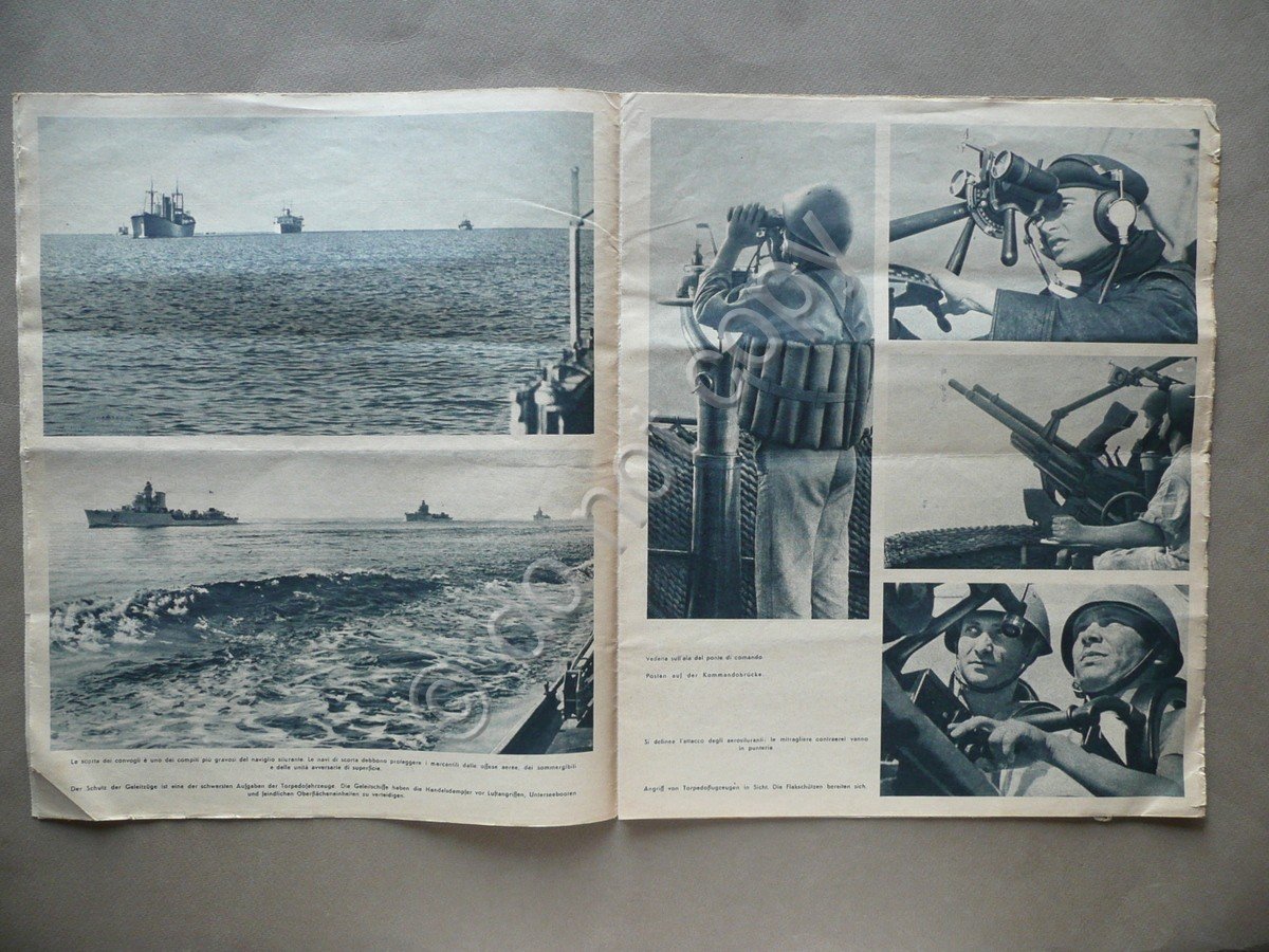 Rivista, Documenti di vita italiana numero 17 15 gennaio 1942 Roma 1942, cm 34,5x28,5, pp. non num. (pp. 16) con numerosissime ill. fot. virate al blu nel testo e fuori testo, esemplare a fogli sciolti. Numero completo. Testo bilingue italiano - tedesco. Condizioni di conservazione Esemplare in buone condizioni con tracce d'uso, lieve traccia di piega centrale di conservazione, margini lievemente rifilati e con minimi strappetti, qualche angolo inf. con lieve traccia di pieghetta, ultima pagina con un paio di piccole lievi abrasioni e qualche lievissima brunitura. Numero dedicato alle navi siluranti, alle loro attività, alle operazioni di guerra in cui vengono impiegate, alla vita di bordo. Testo bilingue (italiano - tedesco). SC03.D9575 N F
