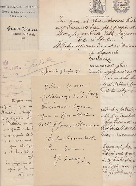 Fascisolo contenente documentazione avente ad oggetto una cusa per la compravendita di carbone fra Mariani Emilio negoziante in carbone e domiciliato nel comune di San Miniato contro Lenzi Fortunato residente a Collelungo in comune di San MIniato nella qualità di agente die beni dei sigg. Paganelli. La cartella contiene In carta bollata la sentenza della causa stessa (11 pagine), corrispondenza con la pretura di San Miniato, varie pagine di appunti, una lettera a firma Fortunato Lenzi, due lettere dell'ufficiale giudiziatio, una lettera su carta intestata "Amministrazione Paganelli, tenute di Collelungo e Marti, Palaia (Pisa)".
