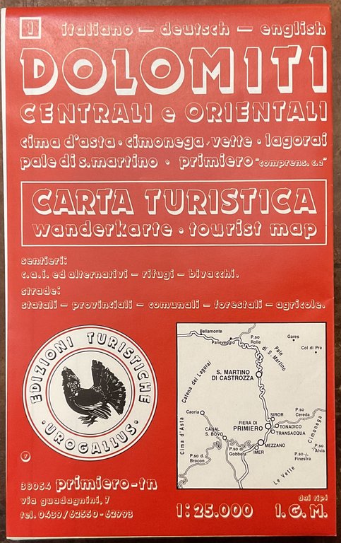 Dolomiti centrali e orientali. Cima d’asta. Cimone fa. Vette. Lagorai. Pale di San Martino. Primiero. Carta turistica 1:25000