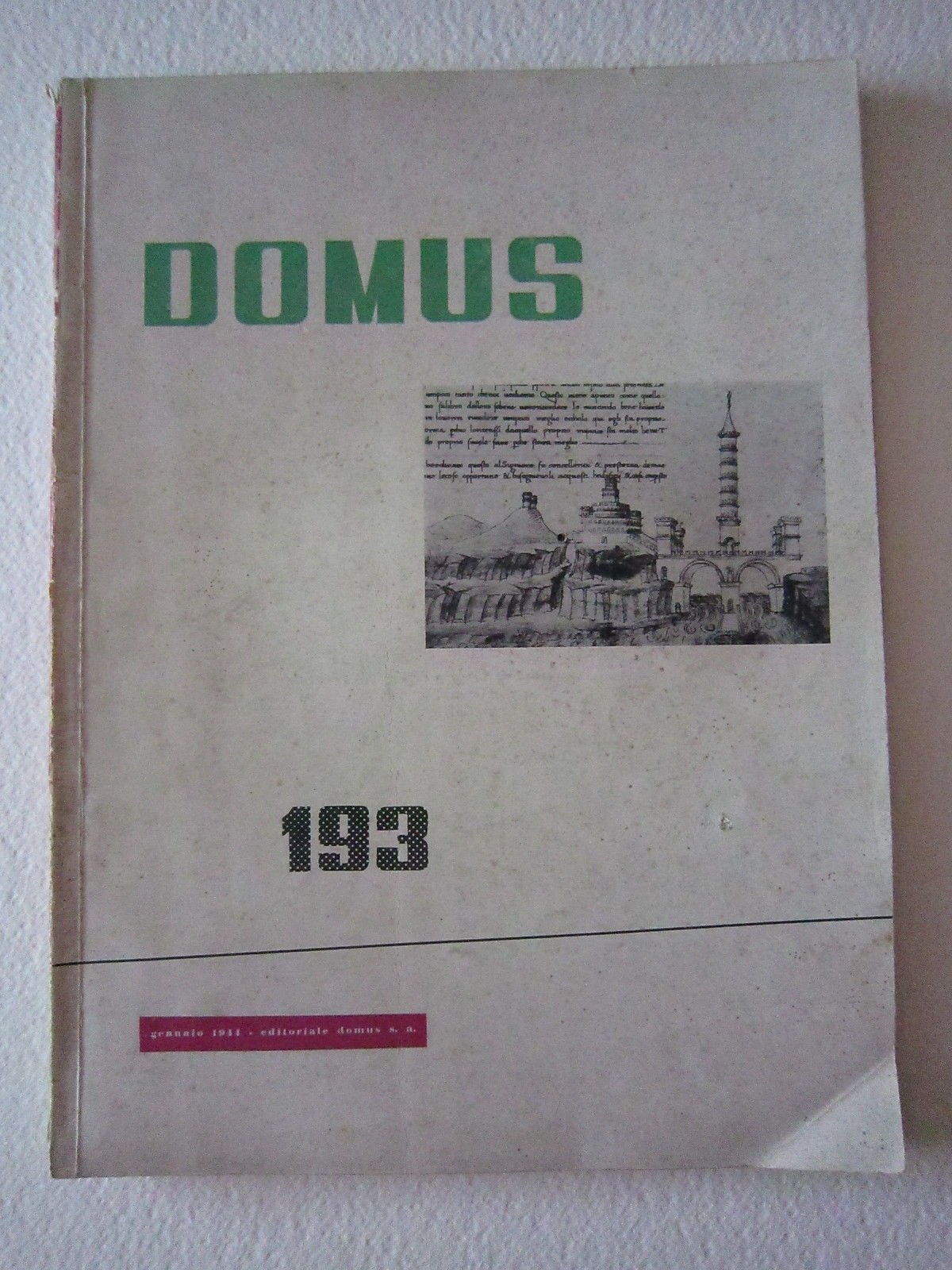 Vedere la descrizione dettagliataRivista, Domus - Rivista mensile - numero 193 gennaio 1944 Domus ed., Milano, 1944; 32x25 cm., I-X + pp. 36 con moltissime ill. in b. n. e a colori n. t. e f. t., con belle tavole di pubblicità, br. ed. a col. Condizioni di conservazione. Esemplare con traccie d'uso, strappetto alla cuffia superiore del dorso, mancanza alla cuffia inferiore del dorso, pieghetta all'angolo inferiore, dorso con leggere abrasioni, piccolo forellino centrale a tutto il fascicolo. SC03.D6804 fe blu Per altri volumi e documenti su questo e altri argomenti visitate il negozio Libreria Grandangolo" su CONDIZIONI DI VENDITA Spedizione Fino a 5 kg piego di libri raccomandato, oltre i 5 kg pacco postale. Si ricorda che l'imballo viene eseguito con la massima cura. La merce viene spedita a pagamento avvenuto e viaggia a rischio e pericolo dell'acquirente. Per maggiori informazioni vedi la pagina SPEDIZIONI del nostro negozio. Ritiro diretto Siamo disponibili per il ritiro diretto a Modena e a Milano. Per gli indirizzi delle sedi vedi la pagina DOVE SIAMO del nostro negozio. Acquisti multipli Se si acquistano più libri, la spedizione si paga una sola volta, purché si rispettino gli scaglioni di peso. Estero / Foreign For international shipment, please contact us. Metodo di pagamento Pay Pal, bonifico bancario, versamento postale (cc/p, vaglia o altro). La spedizione avverrà entro i primi 4 giorni lavorativi dopo la conferma di avvenuto pagamento. Si emette ricevuta fiscale e a richiesta fattura. Il pagamento deve essere effettuato entro 7 giorni lavorativi dalla data di acquisto, trascorsi i quali l'oggetto sarà rimesso in vendita. Feedback Viene rilasciato dall'acquirente dopo il ricevimento di quanto acquistato. Data la sua importanza, vi invitiamo a leggere il breve testo della pagina FEEDBACK del nostro negozio. Pertanto, in caso di qualsiasi problema, non esitate a contattarci. Diritto di recesso L'acquirente ha il diritto di restituire l'oggetto entro 10 giorni ed essere rimborsato, escluse le spese di porto e imballo. L'oggetto deve essere restituito, dopo previa comunicazione, imballato e nelle medesime condizioni di come era all'origine. Creato da Turbo Lister Strumento gratuito per mettere in vendita i tuoi oggetti. Metti in vendita i tuoi oggetti in modo facile e veloce e gestisci le inserzioni in corso. "