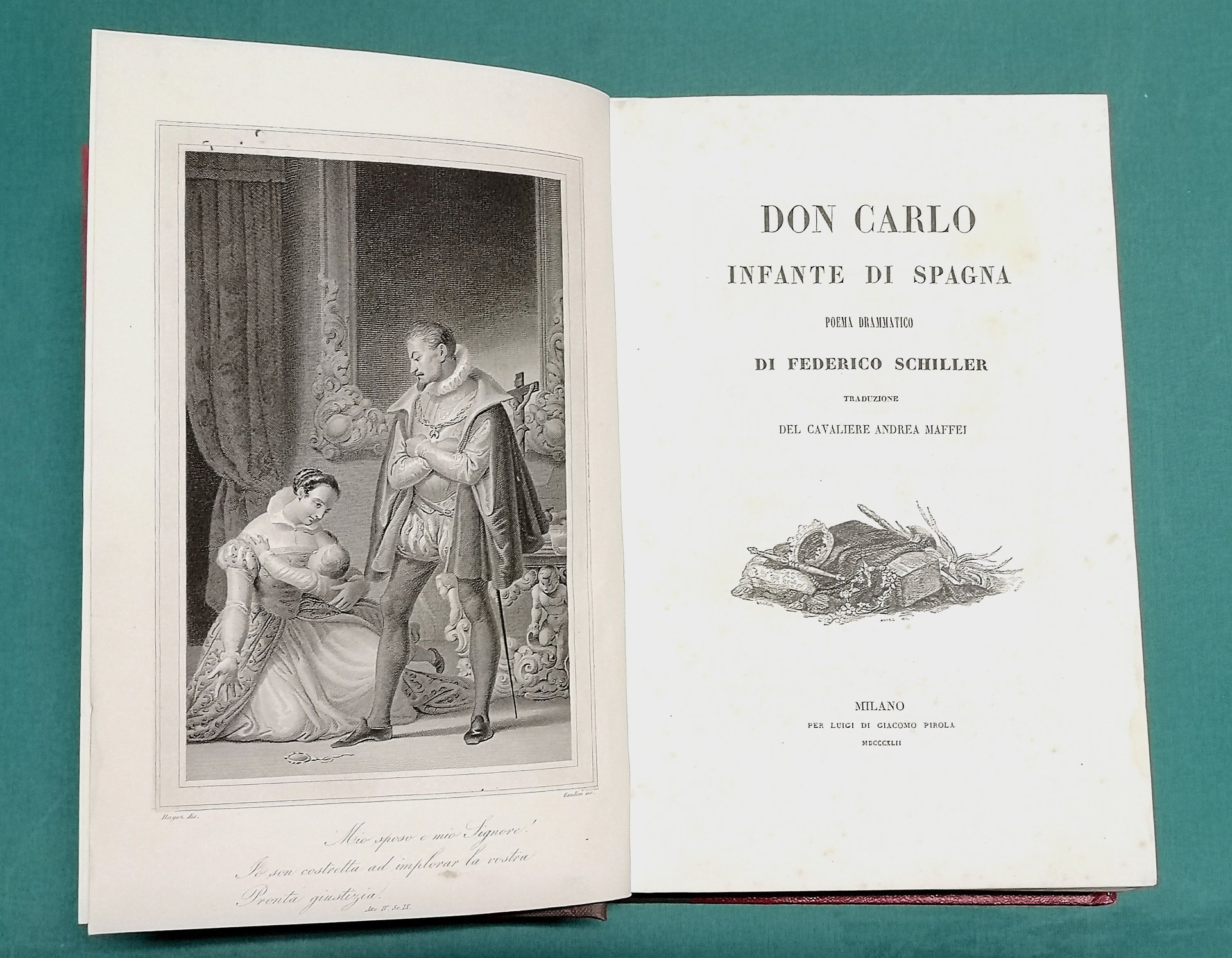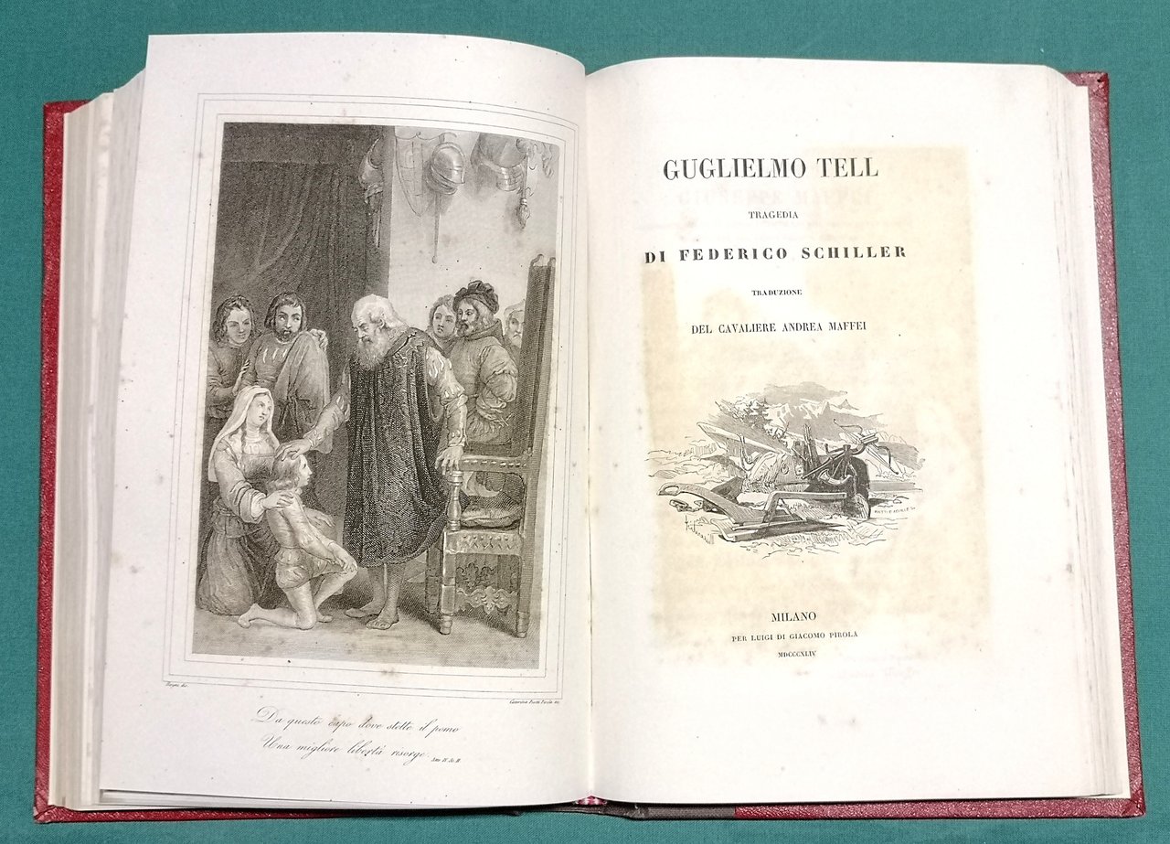 >2 opere in un vol. in-8, pp. 340, 225; leg. poster. m. tela. Ciascun' opera con bell'antiporta dis. da Hayez ed inc. da Gandini, vignetta sul tit., testatine, ogni pag. con bordura ornamentale. Bella ed accurata traduzione in lingua italiana di ambedue le opere del grande drammaturgo tedesco (1759-1805). Il “Don Carlo”, poema drammatico in cinque atti in versi, dedicato dal Maffei a Tomm. Grossi, è il notissimo poema drammatico, assai complesso, terminato nel 1787 e pubblicato nella sua veste definitiva il medesimo anno. Il “Guglielmo Tell”, tragedia in cinque atti in versi, dedicata a Gius. Maffei, rappresentata per la prima volta nel 1804, consacra il rivoluzionario protagonista a simbolo eroico e patriottico della nazione svizzera. Al trentino A. Maffei (1798-1885), librettista e drammaturgo, va il merito di aver contribuito a far conoscere e gustare agli Italiani molti capolavori della lirica transalpina. Bell'esempl. (con lievi fioriture). Diz. Bompiani, Opere II, 804 e III, 732.