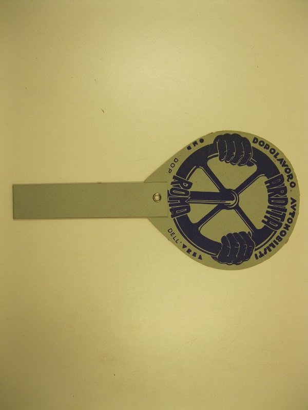 Oggetto pubblicitario della dopolavoro automobilisti Ardita di Roma, ruota in cartoncino con supporto girevole che aperto diventa una paletta con illustrazione in blu di un cerchione sorretto da due mani e la scritta Ardita Roma.