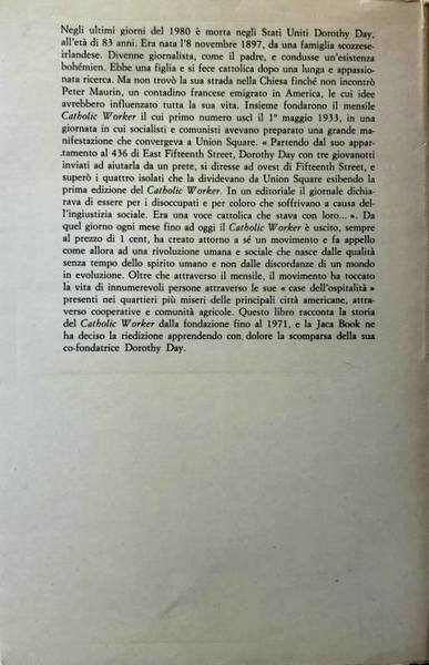 "Nella prefazione a 'Loaves and Fishes' (Pani e pesci), alla domanda «Che cos'è "The Catholic Worker"?», Dorothy Day rispondeva: «Prima di tutto, si tratta di un mensile di otto pagine in formato tabloid. Si occupa di questioni quali il lavoro e gli uomini, i problemi della povertà e dell'indigenza - e la relazione dell'uomo con i suoi fratelli e con Dio. Nel cercare di far emergere il nostro amore per i fratelli parliamo e scriviamo molto delle opere di misericordia come della forma più diretta di azione. "Azione diretta» è uno slogan da vecchi radicali. [.] Oggi, per il movimento pacifista, azione diretta significa salire sui sottomarini armati con i missili Polaris, andare a Mosca ed entrare con le navi nelle aree dove si conducono test nucleari. Peter Maurin, il cofondatore di "The Catholic Worker", ripeteva senza posa che le opere di misericordia sono la forma più diretta di azione che ci sia. "Ma la verità va ribadita ogni 20 anni", aggiungeva». Queste parole sono state scritte nel 1963, nel pieno della Guerra Fredda, e all'epoca «The Catholic Worker» usciva da trent'anni. Più di cinquant'anni dopo il mondo è cambiato, ma molto è rimasto identico. La divisione fra ricchi e poveri, la sfida della guerra e della violenza proseguono invariate; e invariati sono rimasti anche gli imperativi del Discorso della Montagna, la visione del regno di Dio, e l'ideale di Peter Maurin e dei direttori di «The Catholic Worker» di «creare una società in cui sarà più facile essere buoni». Il messaggio di «The Catholic Worker», a oltre ottant'anni dalla sua fondazione e a più di trenta dalla morte di Dorothy Day, rimane attuale e rilevante come un tempo. Merita di essere ribadito. (Robert Ellsberg).