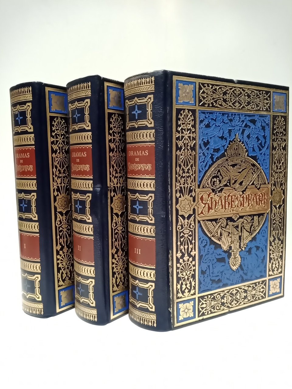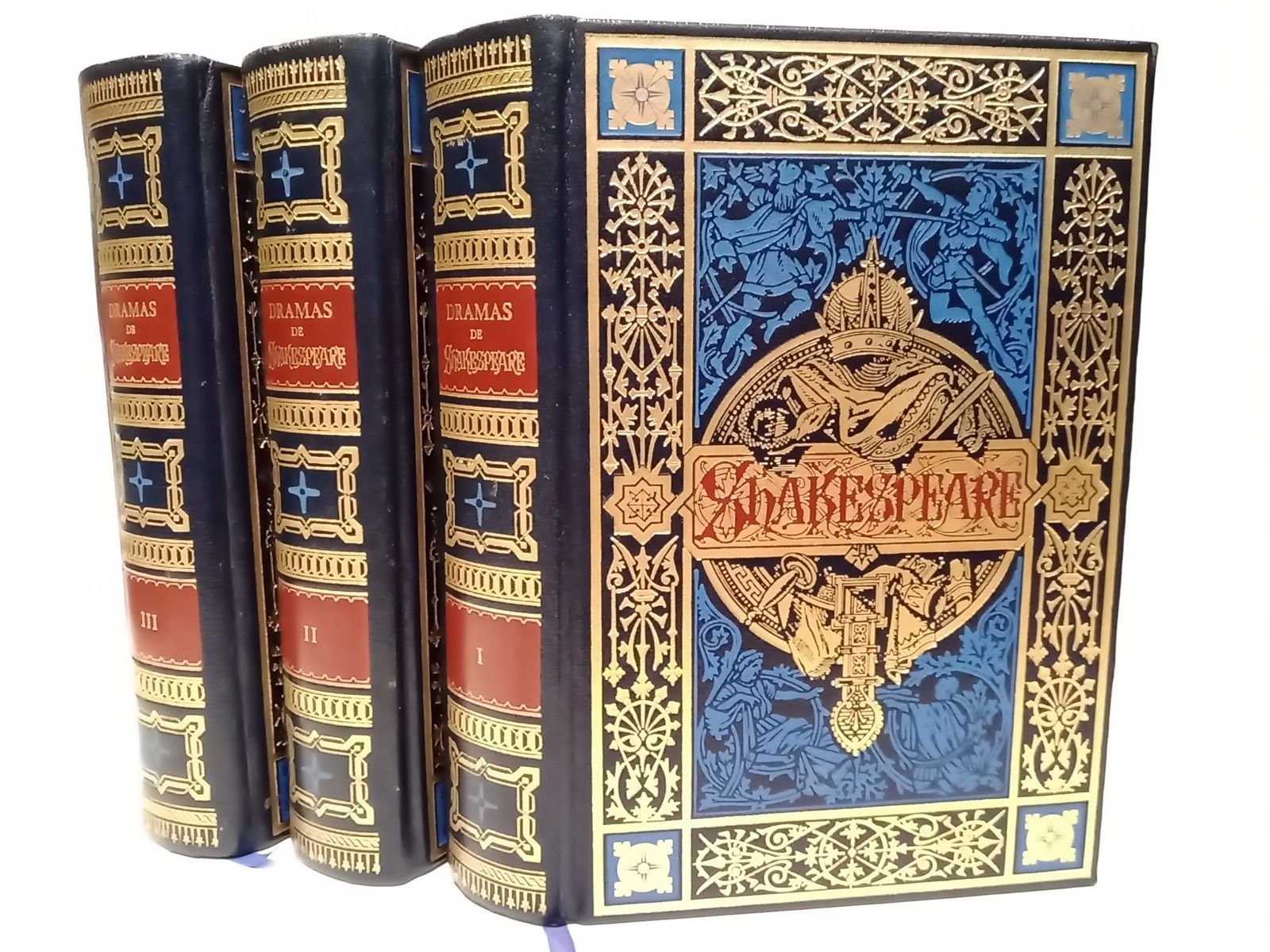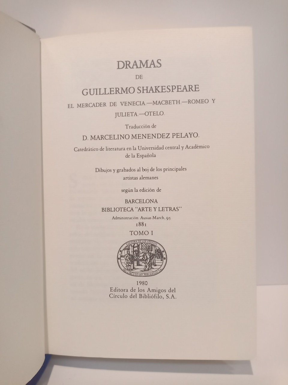 Dramas de Guillermo Shakespeare. Tomo 1: El mercader de Venecia; Macbeth; Romeo y Julieta; Otelo. Tomo 2: Julio César; Como gustéis; Comedia de equivocaciones; Las alegres comadres de Windsor. Tomo 3: Sueño de una noche de verano; Medida por medida; Coriolano; Cuento de invierno / Traduc. de D. Marcelino Menéndez Pelayo; Dibujos y grabados al boj de los principales artistas alemanes según la edición de Barcelona, Biblioteca Arte y Letras, 1881