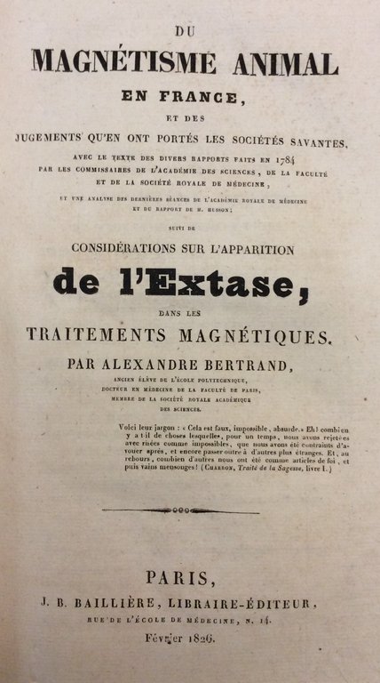 In-8 p. (mm. 220x133), tela mod., tit. su etichetta al dorso, conserv. cop. orig., pp. (4),XXIX,(3),539,32 (di catalogo editoriale). "Edizione originale". Avec le texte des divers rapports faits en 1784 par les Commissaires de l'Académie des Sciences, de la Faculté et de la Société Royale de Médecine, et une analyse des dernières séances de l'Académie Royale de Médecine et du rapport de M. Husson.Una delle maggiori opere sull'argomento, in cui sono trattati: Du magnétisme animal en France: théorie du fluide universel chez les anciens, tentatives de Mesmer pour faire adopter ses opinions à Vienne, apparition du sonnambulisme dans les traitements magnétiques, relation de M. Cloquet sur les traitements de Busancy, etc., etc. - Du sonnambulisme artificiel considéré comme une variété de l'extase - Notes. Cfr. Wellcome,II,155.Solo qualche lieve fioritura marginale, altrimenti esemplare ben conservato, con barbe.
