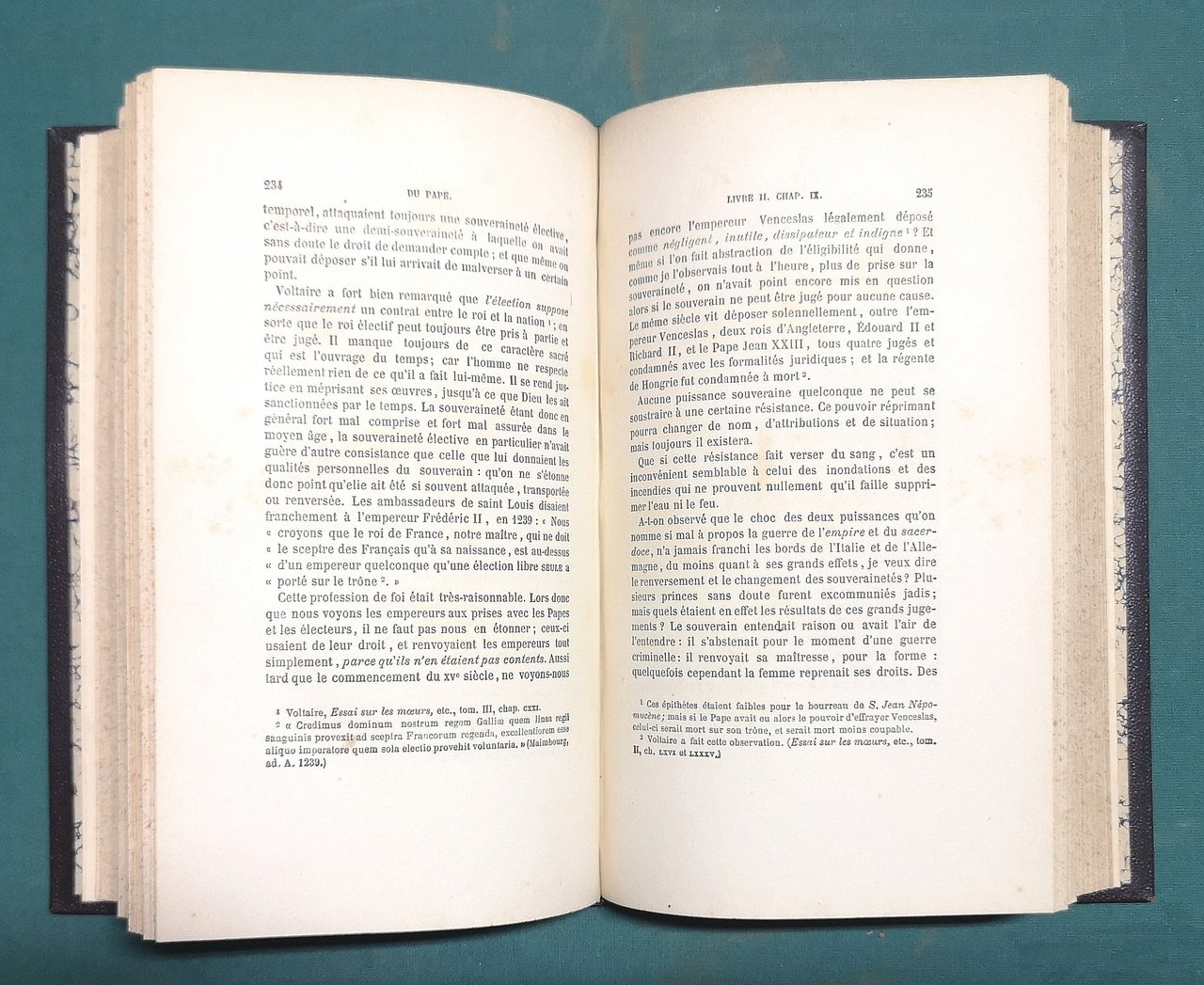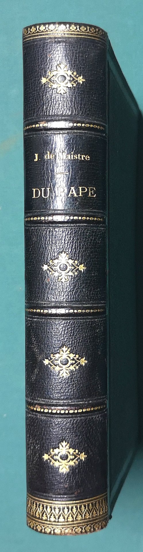 >in-8, pp. XXIV, 503, bella legatura coeva in m. marocchino bruno, titolo e fregi in oro su dorso a nervi, tagli spruzzati. Nota e importante opera polemica di Joseph De Maistre (1753-1821, fratello di Xavier), illustre ed eloquente filosofo cattolico assolutista favorevole ai Gesuiti e contrario alla Rivoluzione Francese, amico di Necker e di Mme de Staël, divenne ambasciatore a St. Petersbourg. Ottimo esemplare.