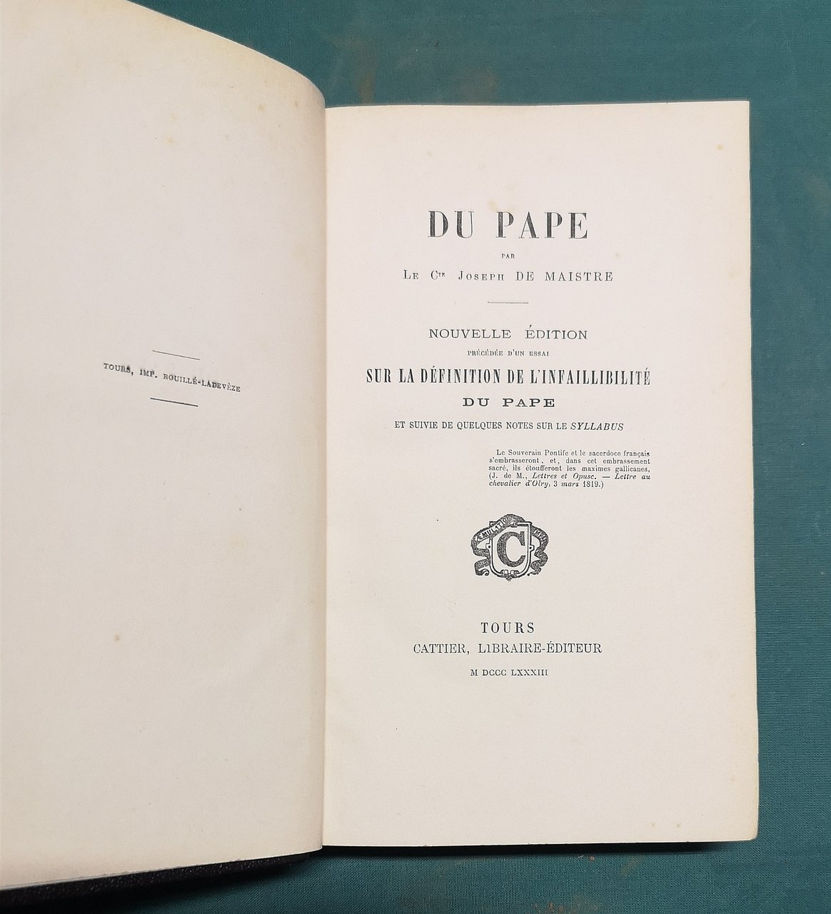 Du pape. Nouvelle édition précédée d'un essai sur la definition de l'infaillibilité du pape et suivi de quelques notes sur le Syllabus.