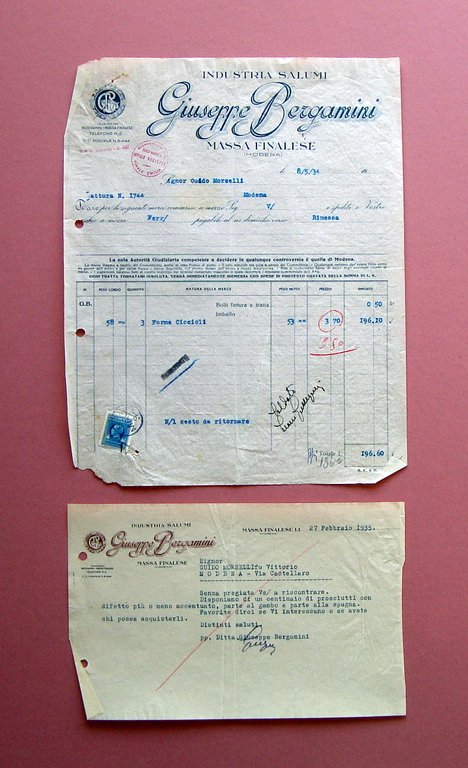 Due Fatture Giuseppe Bergamini Industria Salumi Massa Finalese
