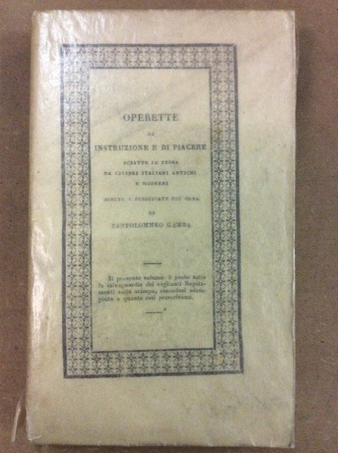 In-16 p. (mm. 170x102), brossura orig., pp. XLV,(3),172, con ritratto dell'Autore inciso in rame. Vi sono contenute: La vita di Dante Alighieri - Pistola di Giovanni Boccacci a Pino de Rossi, introdotte da notizie sulla vita e sulle opere del Boccaccio. Fanno parte di Operette di instruzione e di piacere scritte in prosa da celebri italiani antichi e moderni, scelte e pubblicate per cura di Bartolomeo Gamba.Con lievi arross. e fiorit., ma buon esemplare con barbe.