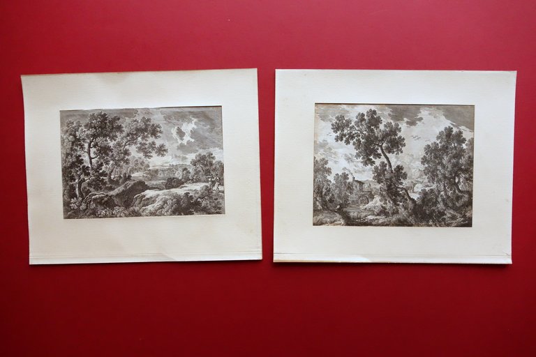 Due incisioni (acquaforte), Due incisioni in bianco e nero paesaggi bucolici fine Settecento circa S. d. ma fine '700 circa; due incisioni originali in b/n, entrambe applicate entro passepartout cartaceo.Cm 26,5x33 con margini bianchi del passepartout; cm 17x22; cm 15x22,5 (le due incisioni). Condizioni di conservazione Incisioni entrambe in buone condizioni con minimi segni del tempo, pressoché trascurabili ondulazioni e bruniture; margini rifilati e con piccole irregolarità (vedi foto). SC03.D18598 N F