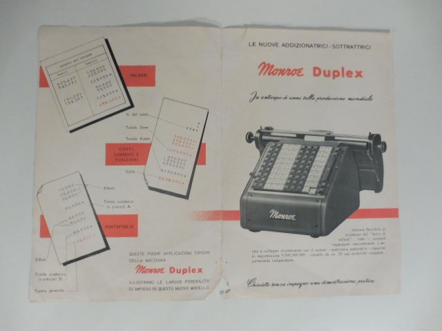 Pieghevole pubblicitario di 4 facciate (ciascuna misura cm 16,5 x 25) con mancanza al margine interno inferiore. Pubblicita' illustrata dell'addizionatrice e sottrattrice Monroe Duplex. Non datato ma anni Quaranta.