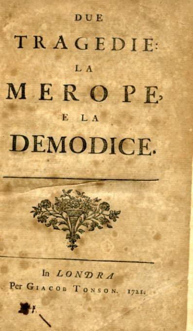 2 parti in un vol. in-8°, pp. 226, (1) di errata, legatura coeva p. pelle marmorizzata con dorso a nervetti adorno di titolo in oro su tassello rosso, fiorellini e filetti in oro entro scomparti. Fregio ornamentale al frontespizio. Testatine, capilettera e finalini istoriati in xilografia. Bruniture sparse. Minimi restauri alle cerniere. Buon esemplare. Edizione congiunta della 'Merope' del Maffei e della 'Demodice' di Giovan Battista Recanati, qui chiamato con lo pseudonimo 'Teleste Ciparissiano'.