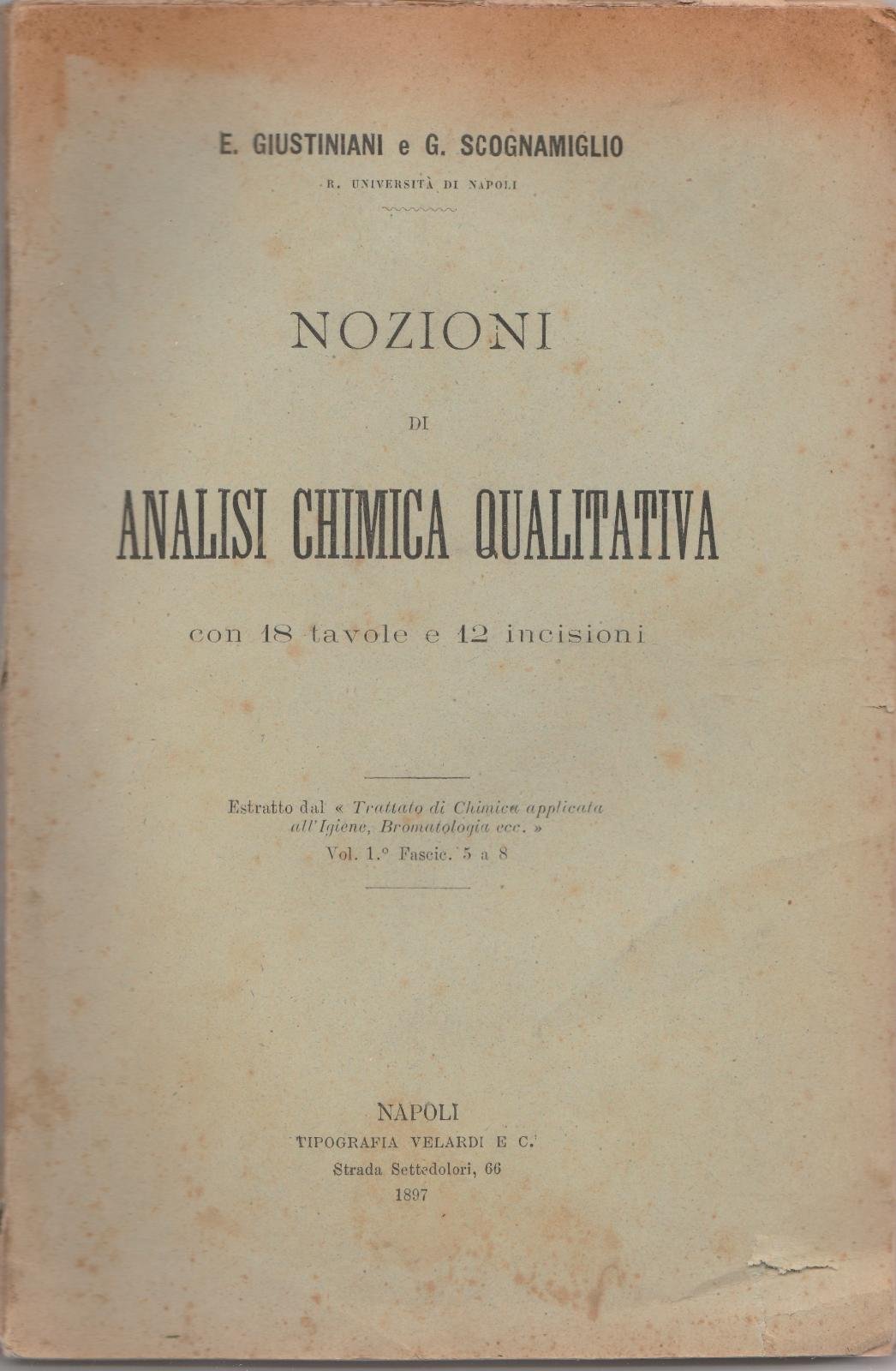 E. GIUSTINIANI G. SCOGNAMIGLIO NOZIONI DI ANALISI CHIMICA QUALITATIVA CON 18 TAVOLE E 12 INCISIONI TIP. VELARDI 1897 L4209 COPERTINA MORBIDA EDITORIALE CON UNO STRAPPO AL MARGINE INFERIORE E MACCHIE AL PIATTO, DORSO CON ALCUNI STRAPPI E UNA PICCOLISSIMA MANCANZA AL MARGINE INFERIORE, LIBRO QUASI DIVISO IN DUE PARTI, TAGLI IRREGOLARI LEGGERMENTE BRUNITI, INTERNO IN BUONO STATO ALCUNE FIORITURE CON 18 TAVOLE PIŸ VOLTE RIPIEGATE, ULTIME PAGINE A FOGLI CHIUSI N. PAG. 70 CM. 24,5 X 16