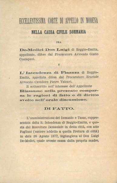 Eccellentissima Corte di appello in Modena nella causa civile sommaria fra De-Medici Don Luigi di Reggio Emilia. e l'intendenza di Finanza di Reggio Emilia. (intorno ad una causa relativa alle tasse demaniali)
