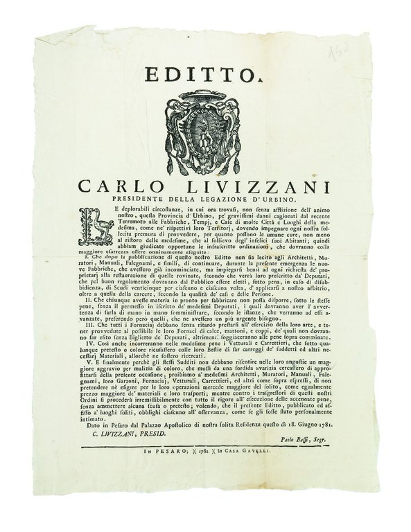 Editto. Carlo Livizzani Presidente della Legazione d�Urbino� Dato in Pesaro dal Palazzo Apostolico di nostra solita Residenza questo dì 18. Giugno 1781