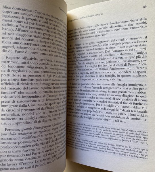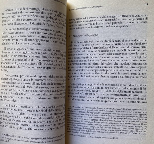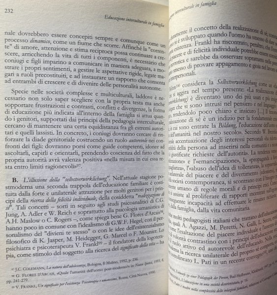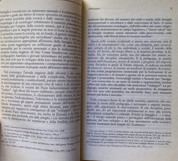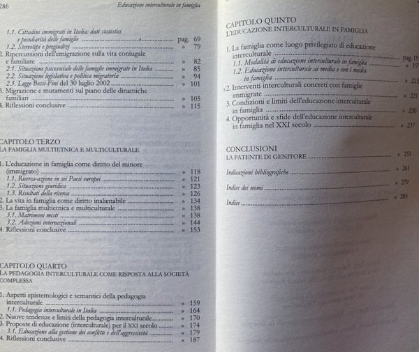 Soggetti: Educazione, Formazione, Psicologia, Famiglia, Scuola, Università, Didattica, Pedagogia interculturale, Famiglie immigrate, Stranieri, Immigrati, Inclusione, Integrazione, Tradizioni, Trappole culturali, Valori, Identità, Teorie pedagogiche, Scienze sociali, Sociologia, Freud, Bowlby, Ambiente sociale, Etica, Religione, Rispetto, Gruppi sociali, Società, Stress familiare, Ruoli, Donna, Parità, Emancipazione femminile, Clima sociale, Organizzazioni sociali, Organizzazione omeostatica, Autorità, Legami, affettivi, Socializzazione, Libertà, Spontaneismo, Realizzazione di sé, Comunità, Progettualità, Figli, Genitori, Attaccamento materno, Madri, Padri, Crisi, Sistema, Scuole, Territorio, Immigrazione, Saggistica, Libri Vintage Fuori catalogo, Studi culturali, Multiculturalismo, Pluralismo, Antropologia, Educazione cattolica, Chiesa, Personalismo pedagogico, Interdipendenza, Globalizzazione, Stereotipi, Pregiudizio, Legge Bossi-Fini, Politica migratoria, Attualità, Italia, Clandestinità, Vita coniugale, Matrimonio, Minori, Diritti, Cittadinanza, Paesi europei, Dati, Statistiche, Famiglia multietnica, Epistemologia, Semantica, Conflitti, Aggressività, Violenza, Problemi, Limiti, Adozione, Adozioni internazionali, Affido, Leggi, Documenti, Matrimoni misti, Islam, Radicalismo religioso, Riferimento, Bibliografia, ONU, Bambini, Intolleranza, Esclusione, Razzismo, Alloggio, Casa, Abitazione, Regolarità, Accoglienza, Centri, Ricongiungimenti familiari, Lingua, Burnout, Lavoro, Mutamenti familiari, Bohm, Bonifazi, Brezinka, Delors, Caritas, Spagna, Francia, Durkheim, Papa, Favaro, Galli, Fornari, ISTAT, EURISPES, Fondazioni, Associazioni, Gentile, Croce, Hegel, Goleman, Maslow, Lévy-Strauss, Weber, Lèvinas, Rousseau, Roveda, Pati, Pestalozzi, Mounier, Natale, Piaget, Viganò, Strozza, Sullivan, Tognetti Bordogna, Agazzi, Habermas, Popper, Lambruschini, Marx, Maritain, Rogers, Vita matrimoniale, Education, Training, Psychology, Family, School, University, Didactics, Intercultural Pedagogy, Immigrant Families, Foreigners, Immigrants, Inclusion, Integration, Traditions, Cultural Traps, Values, Identity, Pedagogical Theories, Social Sciences, Sociology, Social Environment, Ethics, Religion, Respect, Social groups, Society, Family stress, Roles, Woman, Equality, Women's empowerment, Social climate, Homeostatic organization, Authority, Bonds, affective, Socialization, Freedom, Spontaneism, Self realization, Community, Planning, Children, Parents, Maternal attachment, Mothers, Fathers, Crisis, System, Schools, Territory, Immigration, Non-fiction, Out of print books, Cultural studies, Multiculturalism, Pluralism, Anthropology, Catholic education, Church, Pedagogical personalism, Interdependence, Globalization, Stereotypes, Prejudice, Migration policy, Current affairs, Italy, Clandestinity, Marital life, Marriage, Minors, Rights, Citizenship, European countries, Data, Statistics, Multi-ethnic family, Epistemology, Semantics, Conflicts, Aggression, Violence, Problems, Limits, Adoption, International adoptions, Custody, Laws, Documents, Mixed marriages, Religious radicalism, Reference, Bibliography, Children, Intolerance , Exclusion, Racism, Accommodation, Home, Dwelling, Regularity, Reception, Centers, Family reunification, Language, Work, Family changes, Spain, France, Pope, Foundations, Associations, Marriage life, Italy