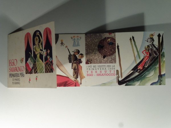 Pieghevole pubblicitario cm 42 x 9,5, ripiegato a 3 falde, interamente dedicato alle stoffe d'ispirazione abissina dell Societa' an. Bernocchi realizzate con il tessuto Ego - Sniafiocco. L'immagine della parte posteriore, sebbene non firmata, e' nota come opera di Araca pseudonimo di Enzo Forlivesi Montanari, artista che produsse molte immagini proprio per Ego - Snia fiocco e per molte altre campagne della Snia Viscosa