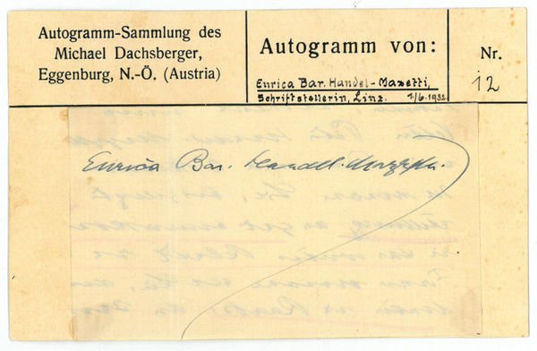 1 S. Qu.-8vo. Aus der “Autogramm-Sammlung des Michael Dachsberger, Eggenburg, N.-Ö.” (so auf der Textseite gedr.) und mit montiertem, die Schriftstellerin im Profil abbildenden Zeitungsausschnitt auf der Bildseite. - Das vom Sammler auf der Textseite vermerkte Datum “Linz 1. 6. 1932” bezieht sich wohl auf die auf der Bildseite vermerkte Notiz “Erhalten von H. Kastner, Pressverein. Eggenburg”. - Nach ersten Veröffentlichungen in Zeitschriften errang Handel-Mazzetti mit den Romanen ‘Meinrad Helmpergers denkwürdiges Jahr’ (1900) und ‘Jesse und Maria’ (2 Bde., 1906) bleibende Anerkennung. Handel-Mazzetti, die "in Form des breitangelegten historischen Romans, vor allem die Zeit des Barocks und der Gegenreformation thematisierend, die Auseinandersetzung zwischen Katholizismus und Protestantismus" behandelt, "bekannte sich zum Fortbestand eines katholischen Habsburgerreiches, bemühte sich jedoch in ihrem Werk um konfessionelle Verständigung und christliches Humanitätsdenken. 1914 erhielt Handel-Mazzetti den Ebner-Eschenbach-Preis. Seit 1951 wird der Handel-Mazzetti-Preis verliehen. Ihre zahlreichen historischen Romane und Novellen erschienen bis in die sechziger Jahre in zum Teil hohen Auflagen" (DBE). Vgl. auch Kosch VII, 257f.