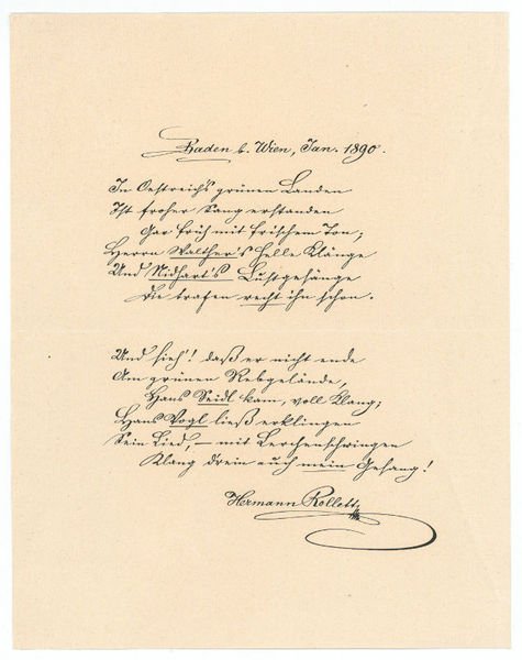 1 S. Gr.-8vo. In Oesterreichs grünen Landen | Ist froher Sang entstanden | Gar früh mit frischem Ton; | Herrn Walther's helle Klänge | Und Nidhart's Lustgesänge | Die trafen recht ihn schon. || Und sieh'! daß er nicht ende | Am grünen Rebgelände, | Hans Seidl kam, voll Klang; | Hans Vogl ließ erklingen | Sein Lied - mit Lerchenschwingen | Klang d'rein auch mein Gesang! - Der Vormärz-Lyriker Hermann Rollett wurde wegen revolutionärer Gesinnung polizeilich verfolgt, floh 1845 nach Deutschland und später in die Schweiz. 1854 vorübergehend nach Österreich zurückgekehrt, promovierte er 1857 in Gießen zum Dr. phil. und studierte später Pharmazie in Wien. Rollett gehört neben Moritz Hartmann und Hermann Jellinek zu den bekannteren Vertretern der Bewegung "Junges Österreich" und bekannte sich zum Deutschkatholizismus. - MEGA III/3, 125.