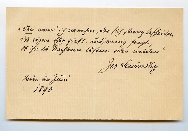 1 S. Qu.-8vo. Den nenn' ich vornehm, der sich streng bescheiden | die eigne Ehre giebt, und wenig fragt, | ob ihn die Nachbarn lästern oder neiden. - Der Sohn eines Kürschnermeisters debütierte am Theater an der Wien, trat am Brünner Stadttheater auf und kam 1858 ans Wiener Burgtheater, dessen Ensemble er von da an angehörte. “Der Publikumsliebling, der 1865 zum k. k. Hofschauspieler auf Lebenszeit ernannt wurde, brillierte in allen großen Charakterrollen, besonders im Intrigantenfach, und war später auch als Komiker und in Volksstücken erfolgreich” (DBE).