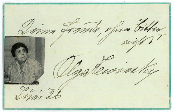 1 S. Qu.-8vo. Olga Lewinsky debütierte 1869 am Grazer Stadttheater, "lernte bei einem Gastspiel in Klagenfurt Josephine Gallmeyer kennen, mit deren Unterstützung sie nach Wien kam, und debütierte 1871 als Jungfrau von Orleans am Burgtheater" (DBE). Später in Prag, Kassel und Leipzig als Heroine engagiert, kehrte sie 1889 ans Wiener Burgtheater zurück, dessen Ensemble sie nach einem Engagement am Hoftheater in Stuttgart (1900-02) und Gastspielreisen von 1906 bis 32 ständig angehörte. Seit 1909 war die Gattin des Hofschauspielers Josef Lewinsky auch Lektorin für Vortragskunst an der Universität Wien. - Mit kleinem alt montierten Portrait (Zeitungsausschnitt).