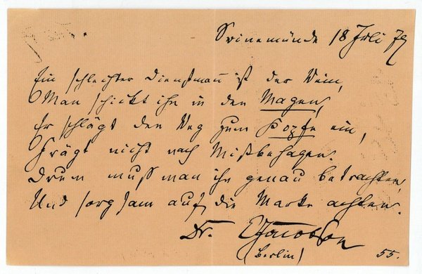 1 S. Qu.-8vo. Ein schlechter Dienstmann ist der Wein, Man schickt ihn in den Magen, Er schlägt den Weg zum Kopfe ein, frägt nicht nach Missbehagen. Drum muß man ihn genau betrachten, Und sorgsam auf die Marke achten [.]. - Jacobson studierte Medizin in Berlin und wurde 1859 promoviert. Nach seinem ersten großen Erfolg als Theaterschriftsteller mit dem Schwank "Faust und Gretchen" (1856) beschloss er sich dieser Tätigkeit fortan von Berufs wegen zu widmen. Zusammen mit Gustav von Moser, Otto Girndt, Rudolf Kneisel und Julius Rosen, zumeist jedoch allein, schrieb er mehr als hundert erfolgreiche Bühnenstücke, Schwänke und Possen.