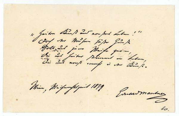1 S. Qu.-8vo. 'Heitre Kunst und ernstes Leben!' | Doch der Musen süße Gunst | Soll uns jene Weise geben, | Die uns heiter stimmt im Leben, | Die uns ernst macht in der Kunst. - Mautner "bethätigte [.] sich als Poet und veröffentlichte mehrere Gedichte [.]" (Eisenberg, Das geistige Wien; zit. n. DBA I, 816, 9), lebte nach 1847 ununterbrochen in Wien und “arbeitete im Laufe der Jahre als Feuilletonist und Theaterkritiker fast aller Wiener und mehrerer ausländischer Blätter. Als Bühnenschriftsteller wurde sein Name besonders durch den Erfolg seines Lustspiels 'Das Preislustspiel' (1852) bekannt" (ebd.). Vgl. auch Kosch X, 600.