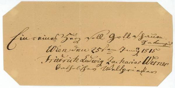 1 S. Qu.-8vo. Ein reines Herz soll Gott schauen | Th a Kempis | Wien den 25ten Juny 1815 | Friedrich Ludwig Zacharias Werner | katholischer Weltpriester. - Zacharias Werner, der 1810 zum katholischen Glauben übergetreten war, war im Jahr zuvor zum Priester geweiht worden.