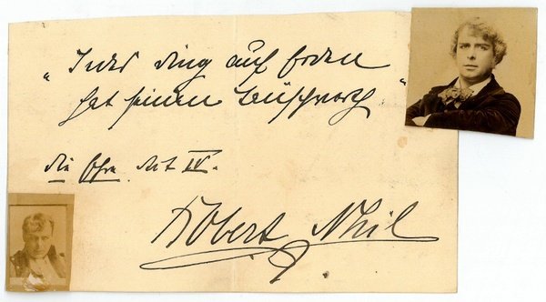1 S. Qu.-8vo. Mit 2 montierten Photographien. Ein Zitat aus Hermann Sudermanns Erstlingsdrama "Die Ehre" (IV. Akt, 2. Szene), das nach seiner umjubelten Premiere am Berliner Lessingtheater i. J. 1889 Sudermanns Ruf begründete, neben Gerhart Hauptmann der bedeutendste Dramatiker des Naturalismus zu sein: "Jedes Ding auf Erden hat seinen Tauschwerth". - Mit Spuren alter Faltung.