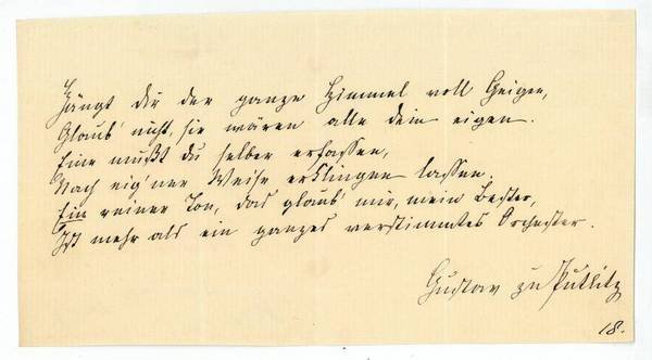 1 S. Qu.-8vo. Hängt dir der ganze Himmel voll Geigen, | Glaub' nicht, sie wären alle dein eigen. | Eine mußt du selber erfassen, | Nach eig'ner Weise erklingen lassen. | Ein reiner Ton, das glaub' mir, mein Bester, | Ist mehr als ein ganzes verstimmtes Orchester. - Nach einem erfolgreichen Debut als Lustspielautor aus dem Regierungsdienst austretend, verfaßte der promovierte Jurist in Folge zahlreiche, an französischen Vorbildern (vor allem Eugène Scribe) orientierte Lustspiele und verschiedene Prosaarbeiten. Sein Märchenidyll "Was sich der Wald erzählt" (1850) erlebte bis zur Jahrhundertwende 50 Auflagen und zahlreiche Übersetzungen. Auch veröffentlichte Putlitz Autobiographisches sowie eine kommentierte Ausgabe der Briefe und Tagebuchaufzeichnungen Karl Immermanns; von 1863-67 war er Intendant des Hoftheaters in Schwerin, seit 1873 in der gleichen Funktion in Karlsruhe tätig.