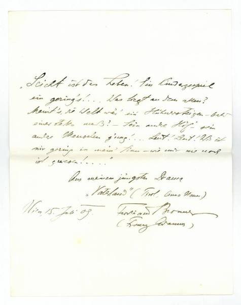 1 S. 4to. Aus meinem jüngsten Drama 'Vaterland' (Tirol, Anno Neun): "Leicht ist das Leben! Ein Kinderspiel ein gering's . Was liegt an dem allen? Meint's, die Welt wär' ein' Hühnersteigen [.]". - Ferdinand Bronner, bekannter unter seinem Pseudonym "Franz Adamus", war Realschulprofessor in Jägerndorf (Schlesien), später Gymnasialprofessor in Wien. Er verfaßte u. a. den viel beachteten Dramenzyklus "Jahrhundertwende" ("Familie Wawroch", 1899; "Neues Leben", 1902; "Schmelz der Nibelungen", 1905). Bronner war der Vater von Arnolt Bronnen. - Mit stärkerer Faltspur.