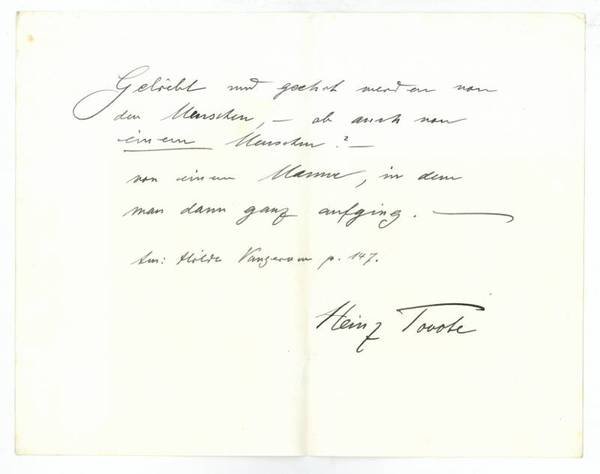 1 S. Qu.-4to. Geliebt und geehrt werden von den Menschen, - ob auch von einem Menschen? - von einem Manne, in dem man dann ganz aufging. - Aus: Hilde Vangerow. - Stärkere Faltspur im Mittelfalz.