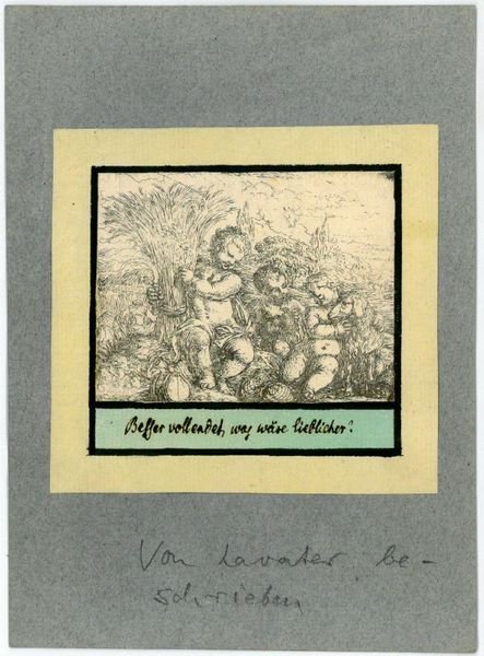 68:88 mm (Bildausschnitt) mit schwarzer Tuschumrahmung auf blau-grauem Trägerpapier; die Beschriftung in hellgrün laviertem Schriftfeld. Besser vollendet, was wäre lieblicher?, so die Untertitelung Lavaters unter der Darstellung dreier Genien mit Ährenbündel und Hund.