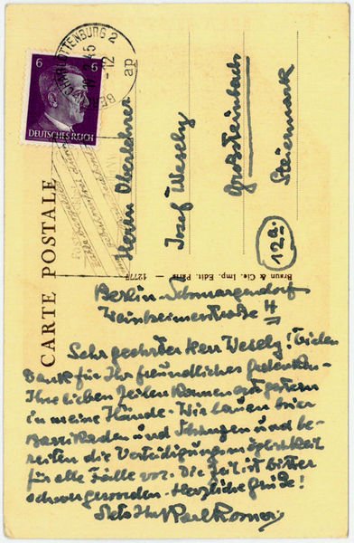 1 S. 8vo. Mit eh. Adresse. Dankt Josef Wesely für ihm übersandte Wünsche zum Geburtstag: “Wir bauen hier Barrikaden und Schanzen und bereiten die Verteidigungsmöglichkeit für alle Fälle vor [.]”. - Rosner, ehedem Redakteur der ‘Gartenlaube’ und später Herausgeber der Cottaschen Monatsschrift ‘Der Greif’, war während des Ersten Weltkriegs Kriegsberichterstatter im Hauptquartier von Kronprinz Wilhelm; anschließend leitete er bis 1934 die Niederlassung des Cotta Verlags in Berlin. Vgl. Kosch XIII, 325f.