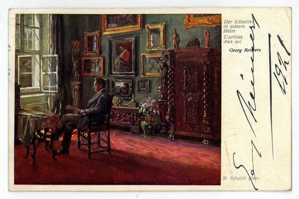 1 S. (Qu.-)8vo. Mit eh. Adresse. An Frln. Emilie Schaup: "Vielen Dank für die freundlichen Zeilen [.]". - Die Bildseite mit der Reproduktion eines Ölgemäldes, das "den Künstler in seinem Heim" darstellt.