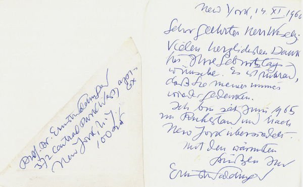 1 S. auf Doppelblatt. Kl.-8vo. Dankt Josef Wesely für ihm übersandte Wünsche zum Geburtstag. - "[.] Ich bin seit Juni 1965 im Ruhestand und nach New York übersiedelt [.]". - Eigenh. Absenderausschnitt des Kuverts mit der Adresse Waldingers beiliegend. - Waldinger meldete sich 1915 freiwillig zum Militär und wurde 1917 in Rumänien so schwer verwundet, daß er vorübergehend stumm war und mühsam wieder sprechen lernen mußte. 1917-21 studierte er in Wien Geschichte, Kunstgeschichte und Germanistik und war nach der Promotion 1922-38 Angestellter in einem Wiener Fachbuchverlag. Waldinger, der seit 1913 Gedichte schrieb, schloß Freundschaft mit Theodor Kramer und Josef Weinheber. 1934 veröffentlichte er seinen ersten Gedichtband "Die Kuppel", der einen an traditionellen Formen orientierten Gestaltungswillen ohne manieristische Experimente erkennen läßt. 1938 emigrierte Waldinger in die USA, war als Bibliotheksangestellter und in einem Warenhaus tätig, arbeitete 1944-46 im amerikanischen Verteidigungsministerium und gehörte 1946 zu den Gründern des Aurora-Verlags. 1947-65 war er Prof. der deutschen Sprache und Literaturgeschichte am Skidmore College in Saratoga Springs (New York). In seinen späten Gedichten (Zwischen Hudson und Donau, 1958) konzentrierte sich Waldinger auf seine verlorene Heimat und nahm Stellung zu politischen Ereignissen wie dem Kriegsausbruch oder dem Warschauer Ghettoaufstand.