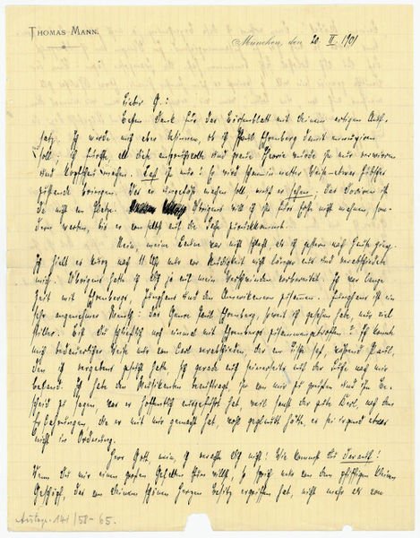 2 SS. Gr.-4to. Auf Briefpapier mit Briefkopf "Thomas Mann". An seinen Jugendfreund, den späteren Kunsthistoriker und Romanisten Otto Grautoff (1876-1937): "Lieber G.: Besten Dank für das Börsenblatt mit Deinem artigen Aufsatz [d. i. "Die Ex-libris-Sammlung des Grafen zu Leuningen-Westerburg" im Börsenblatt f. d. dt. Buchhandel 68 (1901), S. 1421-24]. Ich werde mich aber besinnen, ob ich Paul Ehrenberg damit ennuyiren soll; ich fürchte, all diese anspruchsvolle und graue Theorie würde ihn nur verwirren und kopfscheu machen. Laß ihn aus! Er wird schon in netter Weise etwas Hübsches zustande bringen. Was er ungefähr machen soll, muß er sehen; das Dociren ist da nicht am Platze. [Zwei Wörter getilgt] Übrigens will ich ihn fürs Erste nicht mahnen, sondern warten, bis er von selbst auf die Sache zurückkommt. - Nein, meine Laune war nicht schlecht, als ich gestern nach Hause ging. Ich hielt es kurz nach 11 Uhr nur vor Müdigkeit nicht länger aus und verabschiedete mich. Übrigens hatte ich Dich ja auf mein Verschwinden vorbereitet. Ich war lange Zeit mit Ehrenbergs, Junghans [der Kunstakademieschüler Julius Paul Junghanns] und den Amerikanern zusammen. Junghans ist ein sehr angenehmer Mensch: das Genre Paul Ehrenberg, soweit ich gesehen habe, nur viel stiller. Bist Du schließlich noch einmal mit Ehrenbergs zusammengetroffen? Ich konnte mich bedauerlicher Weise nur von Carl verabschieden, der am Tische saß, während Paul, den ich vergebens gesucht hatte, sich gerade auch seinerseits auf der Suche nach mir befand [.] Herr Gott, nein, ich verachte Dich nicht! Wie kommst Du darauf! Wenn Du mir einen großen Gefallen thun willst, so sprich nur von dem pfiffigen kleinen Geschöpf, das von Deinem schönen Herzen Besitz ergriffen hat, nicht mehr als von 'Deinem Mädel'. Denn erstens ist diese Bezeichnung ja nicht zutreffend und zweites wirkt sie auch gar zu zusammenziehend. Im Übrigen bin ich überzeugt, daß Du Dich kolossal falsch benommen hast. Die Franzosen sagen: Wenn der Deutsche graziös sein will, so springt er zum Fenster hinaus. Etwas Ähnliches gilt meistens auch von 'uns Todten', wenn wir 'erwachen', d. i. wenn wir einmal Menschen sein möchten. Meistens! Es gehört sehr viel Geschmack und Stilgefühl dazu, da nicht zu outriren, sich nicht zu verzerren. Na, Stil . es weiß eben nicht Jeder, was das ist: nicht einmal alle Mitarbeiter des Börsenblattes für den deutschen Buchhandel. Ehrlich: (und Du weißt das ja auch) Du machst mich nervös, wenn Du Fasching spielst, und schon darum bin ich froh, daß der Fasching vorüber ist. Nervös machtest Du mich zum Beispiel (und augenscheinlich nicht nur mich) durch das blöde Gekreisch, mit dem Du gestern im Café L[uitpold] Paul Ehrenberg empfingst. Es ist dumm und roh, zu glauben, daß dies, selbst in der Fastnacht, die richtige Art ist, ihm zu begegnen. Dir kann es ja gleichgültig sein, was er von Dir denkt, da hast Du Recht. Ich fürchte nur, daß er manchmal nicht weiß, was uns - Dich und mich - eigentlich verbindet. - Nichts für ungut übrigens! Wir haben schließlich Aschermittwoch. Und damit, daß am Sonntag der Carneval bei meiner Schwester [Julia Löhr] noch ein kleines Nachspiel haben soll, bin ich durchaus einverstanden [.]". Kl. Ein- und -ausrisse (ohne Textverlust). - Nach Grautoffs Tod im Pariser Exil erwarb der Verleger Kurt Leo Maschler (1898-1986) die Korrespondenzsammlung von dessen Witwe Erna Grautoff. Nach Maschlers Flucht aus Österreich 1938 wurde der zurückgelassene Bestand von der Gestapo der ÖNB überstellt und von dieser in deren Autographensammlung einsigniert (am unteren Rand die ÖNB-Signatur von 1939: Autogr. 141/58-65). 1949 wurde die Sammlung an Maschler rückgestellt (vgl. ÖNB, Allg. Verwaltungs- u. Korrespondenzakten 00/1949 A); erworben aus dem Nachlaß Maschler. - T. Mann, Briefe an Otto Grautoff 1894-1901 und Ida Boy-Ed 1903-1928, hg. von Peter de Mendelssohn (Frankfurt a. M. 1975), S. 133f. Die Briefe Thomas Manns. Regesten und Register. Bd. I. Briefe 1889-1933, bearb. und hg. von Hans Bürgin u. a. (Frankfurt a. M. 1976) 01/12. T. Mann, Große Frankfurter Ausgabe, Briefe I (1889-1913) (Frankfurt a. M. 2002), S. 156f.