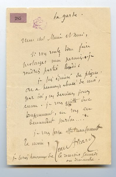 1 S. 8vo. An einen Herrn mit dem Ersuchen, ihm seinen Erlaubnisschein zu verlängern, er würde gerne Donnerstag abreisen. Er sei erschöpft; selbst in den letzten Tagen habe man ihn hier noch hintergangen, daher sein plötzlicher Aufbruch: "Je suis épuisé de fatigue. On a beaucoup abusé de moi, par ici, ces derniers jours encore. Je vous quitte donc brusquement, en vous demandant pardon [.]". - Mit einigen geringfügigen Randläsuren. - Die Recto-Seite mit kl. Registraturetikett und mit dem verschlungenen Monogrammstempel "LS", verso mit hs. Numerierung "4".