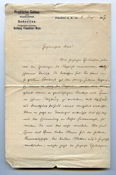 2½ SS. auf Doppelblatt. 8vo. An Julie Kalbeck, die Gattin des Musikschriftstellers u. -kritikers Max Kalbeck: "Mit herzlicher Theilnahme haben wir den Zeitungen die Nachricht entnommen, [welch] schwerer Verlust Sie betroffen hat. Sie stand in so grellem Contrast zu den sonnig-heiteren Tagen - sie waren es trotz des Regens - welche uns vergönnt waren in gemüthlichem Verkehr mit Ihnen im schönen Salzburg zu verleben, daß dieser Gruß aus Frankfurt deshalb etwas verspätet eintrifft [.]". - Der Sohn des Schriftstellers Robert Prölß studierte Philosophie und Geschichte und war anschließend als Journalist in verschiedenen Redaktionen (u. a. 1874/75 in London und von 1877 bis 80 für die Redaktion von "Meyers Konversations-Lexikon" in Leipzig) tätig. Von 1880 bis 88 Chefredakteur des Feuilletons der "Frankfurter Zeitung" und anschließend Redakteur der Zeitschrift "Von Fels zu Meer" in Stuttgart sowie von 1894 bis 1903 Mitarbeiter der "Gartenlaube", trat Prölß auch als Erzähler und Dramatiker hervor. - Auf Briefpapier mit gedr. Briefkopf der "Frankfurter Zeitung"; mit mehreren kl. Randeinrissen und -läsuren.