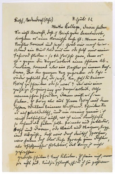 1¼ SS. auf Doppelblatt. Gr.-8vo. Mit einer Beilage (s. u.). An den Schriftsteller und Regisseur Hanns Maria Braun (1810-187): "Werter Kollege, darin haben Sie nicht Unrecht, daß ich Briefe gern beantworte, trotzdem es eine komische Sache ist: Wenn ein Nachbar kommt und sagt: Grab mir nach Feierabend ein Stück Feld um oder hilf mir mein Fahrrad flicken - so tu ich es sehr gern, denn es ist - gegen die Tagesarbeit eine schöne Ablenkung. Kommt aber ein Nachbar zu einem Nachbarn, der den ganzen Tag gegraben oder Fahrrad geflickt hat, der sagt, na, hast du keinen Brief zu schreiben oder so was? Das wär eine geistige Ergänzung zur Tagesarbeit. Also wenn schon schreiben, dann muß es Sinn haben [.]". - Heinrich Lersch war 1914 mit seinem Gedicht "Soldatenabschied" bekannt geworden, "in dem er der Kriegsbegeisterung der Arbeiter Ausdruck verlieh. Nach dem Ersten Weltkrieg kam Lersch in Kontakt mit dem Bund der Werkleute auf Haus Nyland, nahm jedoch eine ablehnende Haltung gegenüber dem Klassenkampf ein und schilderte u. a. in seinem autobiographischen Roman ‚Hammerschläge' (1930) die Lebensbedingungen der Proletarier, die Erfüllung in ihrer Arbeit finden. Er schloß sich den Nationalsozialisten an, die ihn 1933 in die Deutsche Akademie der Dichtung aufnahmen und seinem Werk zu großer Popularität verhalfen" (DBE). 1933 neben 87 anderen Schriftstellern ein Treuegelöbnis für Hitler unterzeichnend, unterstützte er folgerichtig im Jahr darauf einen "Aufruf der Kulturschaffenden" anläßlich der Volksbefragung zur Vereinigung des Amtes des Reichskanzlers und Reichspräsidenten in der Person von Adolf Hitler; 1935 erhielt Lersch den Rheinischen Literaturpreis. - Hanns Maria Braun, häufig unter dem Ps. Johann Gottlieb Dietrich publizierend, war Lektor im Heitz Verlag und Herausgeber der "Kulturpolitischen Rundschau", danach Schriftleiter beim "Völkischen Beobachter" und zuletzt Filmregisseur. Vgl. Kosch I, 911. - Die zwei letzten Zeilen der Recto-Seite von Bl. 1 sowie die oberen Zeilen auf Bl. 2 recto alt ausgeschnitten und mit Tesafilmstreifen erneut eingefügt; beiliegend ein Kuvertausschnitt mit e. Adresse und Absenderstempel.