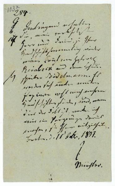 1 S. 8vo. Anliegend erhalten Sie, mein verehrtester Herr und Freund, zu Ihrer Handschriftsammlung wieder einen Brief von Hofrath Reinbeck und dem Schauspieler Seidelmann. Es werden sich unter meinen Papieren wohl noch mehrere Handschriften finden, und, wenn dies der Fall ist, werde ich mir ein Vergnügen daraus machen, sie Ihnen mitzutheilen [.].