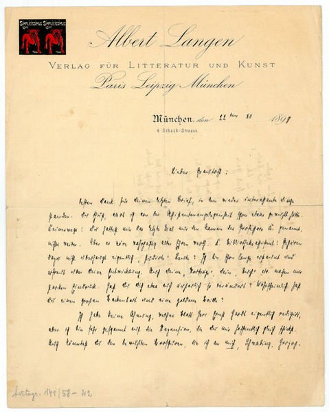 3 SS. auf Doppelblatt. Gr.-4to. Auf Briefpapier des "Simplicissimus" - Albert Langen Verlag. An seinen Jugendfreund, den späteren Kunsthistoriker und Romanisten Otto Grautoff (1876-1937): "Lieber Grautoff: besten Dank für Deinen letzten Brief, in dem wieder interessante Dinge standen. Du thust, als ob ich von der Assistentenangelegenheit schon etwas gewußt hätte. Keineswegs! Du hattest mir das letzte Mal nur den Namen des Professors K. genannt, nichts weiter. Aber es wäre wahrhaftig aller Ehren werth. K. Bibliotheksassistent! Gehören dazu nicht überhaupt 'studirte' Leute? Ich bin schon lange erstaunt und erfreut über Deine Entwicklung. Auch Deine 'Vorträge', Dein 'Buch' etc. machen mir starken Eindruck. Hast Du Dich etwa auch äußerlich so verändert? Wahrscheinlich hast Du einen großen Backenbart und eine goldene Brille? [.] Hattest Du das Gedicht, das schöne Momente hat, für den Simplicissimus berechnet? Ach, dazu ist es zu melancholisch und zu persönlich. 'Wir' brauchen aufgeweckte und überlegene Sachen . was aber 'mich' nicht hindert, ebenfalls hie und da Verse zu schreiben, wie die, welche ich Dir, trotz ihrer Unfertigkeit, vielleicht beilegen werde. - Mit meiner Prosa geht es mir besser. Fischers Rundschau bringt nächstens wieder einmal eine Novelle von mir, und auf jeder Karte 'erwartet' Dr. Bie 'in voller Spannung' meinen Roman. Sein Wohlwollen und Interesse rührt ganz einfach, und ich kann ihn nur bitten, es nicht erlahmen zu lassen, denn er muß sich noch gedulden; es fehlt noch etwa ein Drittel des Buches. Gestern Abend habe ich übrigens einen neuen Abschnitt im Familienkreise vorgelesen [.]". - Am ersten Blatt verso, um 90 Grad nach rechts geneigt, Manns von Platen beeinflusstes, vom Verfasser nicht veröffentlichtes Gedicht "Nur Eins": "Wir, denen Gott den trüben Sinn gegeben / Und alle Tiefen wies, wo Scham und Graun / Sind ewig fremd den Fröhlichen im Leben, / Die harmlos auf des Daseins Spiele schaun. // Und weil der Menschen Seele zu ergründen / Hohnvoll auch mich der Drang gefangen hält, / Will ich es euch mit schwerem Worte künden: / Erkenntnis ist die tiefste Qual der Welt. // Denn Eines ist es, was in allem Leiden / Uns stark erhält und aufrecht fort und fort, / Ein trostreich Spiel voll höchster, feinster Freuden / Den Unglückseligsten: Es ist das Wort." Unbedeutende Randeinrisse. - Nach Grautoffs Tod im Pariser Exil erwarb der Verleger Kurt Leo Maschler (1898-1986) die Korrespondenzsammlung von dessen Witwe Erna Grautoff. Nach Maschlers Flucht aus Österreich 1938 wurde der zurückgelassene Bestand von der Gestapo der ÖNB überstellt und von dieser in deren Autographensammlung einsigniert (am unteren Rand die ÖNB-Signatur von 1939: Autogr. 141/58-42). 1949 wurde die Sammlung an Maschler rückgestellt (vgl. ÖNB, Allg. Verwaltungs- u. Korrespondenzakten 00/1949 A); erworben aus dem Nachlaß Maschler. - T. Mann, Briefe an Otto Grautoff 1894-1901 und Ida Boy-Ed 1903-1928, hg. von Peter de Mendelssohn (Frankfurt a. M. 1975), S. 108f. Die Briefe Thomas Manns. Regesten und Register. Bd. I. Briefe 1889-1933, bearb. und hg. von Hans Bürgin u. a. (Frankfurt a. M. 1976) 98/12. Nicht bei T. Mann, Große Frankfurter Ausgabe, Briefe I (1889-1913) (Frankfurt a. M. 2002).