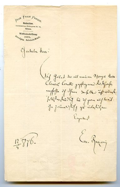 1 S. Gr.-8vo. An einen namentlich nicht genannten Adressaten: "Auf Grund der mit meinem Schwager Herrn Clemens Cerutti gepflogenen Rücksprache empfehle ich Ihnen denselben aufs wärmste [.]". - Der im niederösterreichischen Unternalb geborene Bruder des Malers Gustav Ranzoni wandte sich nach dem Studium der Rechtswissenschaften dem Journalismus zu, schrieb 1848 für oppositionelle Zeitungen wie den "Der Radikalen" oder "Die Reform", wandte sich aber nach kurzer schauspielerischer Tätigkeit 1850/51 als Mitglied des Hofburgtheaters erneut einer schriftstellerischen Tätigkeit zu und wurde Mitarbeiter zahlreicher Zeitschriften und Zeitungen ("Ost-Deutsche Post", "Tribüne", "Der Wanderer", "Der Salon"), in denen seine Gedichte, Erzählungen, Romane und Feuilletons erschienen. Seit ihrer Gründung war Ranzoni für die "Neue Freie Presse" tätig, bis 1873 als Leiter der "Kleinen Chronik", dann als Kulturberichterstatter. 1891 veröffentlichte der Vater des Malers Hans Ranzoni drei Erzählungen unter dem Titel "Jagd- und Schießstand". - Auf Briefpapier mit gedr. Briefkopf der "Neuen Freie Presse"; papierbedingt etwas gebräunt und mit kleinen Randläsuren.