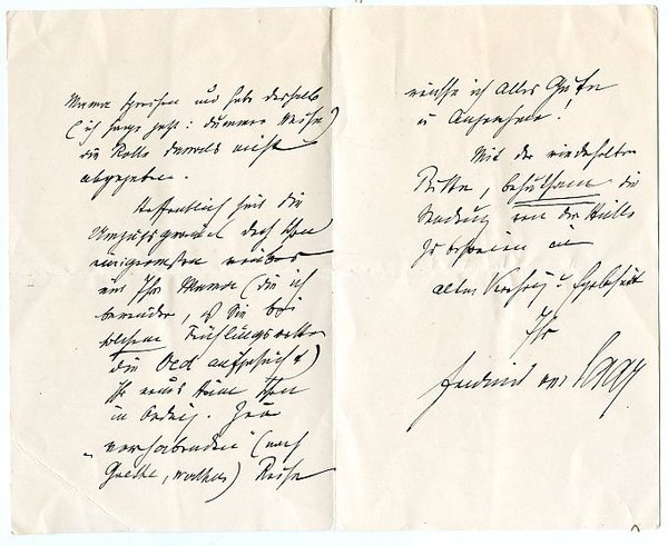 2¾ SS. auf Doppelblatt. 8vo. An ein Fräulein: "Das 'Rire' wird morgen recommandirt an Ihre neue Adresse abgehen. Bitte aber, die Rolle sehr sacht und behutsam zu öffnen, da mir selbst beim Empfang durch rasches und unbedachtes Öffnen das Malheur passirt ist, das Heft durch einen Einriß zu verletzen. Vielleicht war es übrigens schon in dieser Weise verletzt - und ist meine Selbstanklage nicht gerechtfertigt [.]". - Mit einer kleinen Knickfalte am unteren Rand und Spur alter Mittenfaltung.