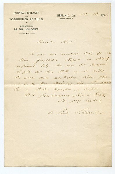 1 S. auf Doppelblatt. 8vo. An einen namentlich nicht genannten Adressaten: “Es war mir unendlich leid, daß ich Ihren freundlichen Besuch im Hotel versäumt habe. Ich kam des Morgens so spät aus dem Bett, daß ich leider Sie nicht mehr angetroffen hätte [.]” (Br. v. 12. XII. 1891). - Paul Schlenther war von 1886-98 neben Theodor Fontane und als Nachfolger Otto Brahms Theaterkritiker der ‘Vossischen Zeitung’, propagierte das neue naturalistische Drama und setzte sich nachdrücklich für die Werke von Ibsen und Hauptmann ein. 1889 Mitbegründer der ‘Freien Bühne’ Berlin, wurde Schlenther 1898 als Direktor des Wiener Burgtheaters bestellt und kehrte 1910 als Theaterkritiker beim ‘Berliner Tageblatt’ nach Berlin zurück. Er war Mitherausgeber der deutschen Ibsen-Ausgabe (1898-1904), verwaltete gemeinsam mit Otto Pniower den Nachlaß Fontanes und edierte dessen Briefe. Vgl. Kosch III, 2493. - Auf Briefpapier mit gedr. Briefkopf der ‘Sonntagsbeilagen zur Vossischen Zeitung’.