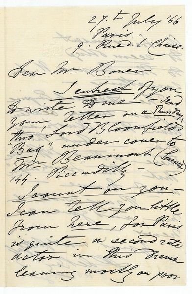2½ SS. auf Doppelblatt. 8vo. Dear Mr. Bouer [?] / I entreat of you to write to me - send your letter on a Thursday, thro' Lord Bloomfield's 'Bag' under cover to Mr. Beaumont (Somerset), 144 Piccadilly. I count on you. I can tell you little from here, for Paris is quite a second rate actor in this drama leaning mostly on poor Austria's consent to seem obliged to the Emperor N. for something. The French Empire is far more beaten than the Austrian one - but then there is this difference that the 'French Empire' is not France. Pray write to me, and give me news [.] Tell me about all our particular friends. - Die schottischstämmige Rose Stewart hatte den französischen Diplomaten und Schriftsteller Henri Blaze de Bury geheiratet, dessen heute bekanntestes Werk wohl seine Faust-Übersetzung darstellt. Durch ihren Salon zählte die u. a. mit Bismarck gut bekannte Baronne zu den hervorragendsten Persönlichkeiten der Pariser literarischen Szene der zweiten Hälfte des 19. Jhs.