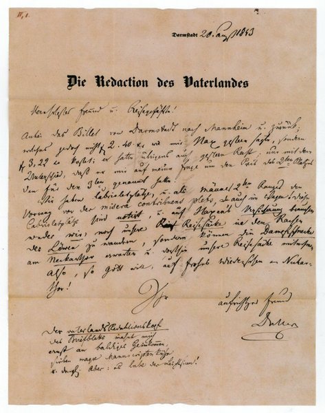 1 S. Folio. Mit eh. Adresse (Faltbrief). An den Juristen und Schriftsteller Karl Buchner (1800-1872): "Anbei das Billet von Darmstadt nach Mannheim u. zurück; welches jedoch nicht fl 2, 40. kr wie mir Max gestern sagte, sondern fl 3, 22 kr kostet; er hatte übrigens auch gestern Recht; nur mit dem Unterschied, dass er mir auf meine Frage um den Preis des 2ten Platzes den für den 3ten genannt hatte. Wir haben Cabrioletplätze, u. als Männer 2ten Ranges den Vorrang vor der misera contribuens plebs, auch im Wagen! Diese Cabrioletplätze sind notiert […]". - Nach rechtswissenschaftlichen Studien an der Univ. Wien lebte Duller seit 1830 als freier Schriftsteller und Journalist in München, Baden-Baden, Trier, Frankfurt/Main und Darmstadt; er schloß sich dort der deutsch-katholischen Bewegung des schlesischen Priesters Johannes Ronge an. Früh veröffentlichte er erste Gedichte und Dramen, war für verschiedene schöngeistige Periodika journalistisch tätig und redigierte 1836-38 die Zeitschrift "Phoenix". Er gab die ersten Buchausgaben von Büchners "Dantons Tod" und Grabbes "Die Hermannsschlacht" heraus. Nach seiner Übersiedelung nach Mainz 1849 wurde er 1851 Prediger der dortigen deutsch-katholischen Gemeinde. - Auf Briefpapier mit gedr. Briefkopf "Die Redaction des Vaterlandes".